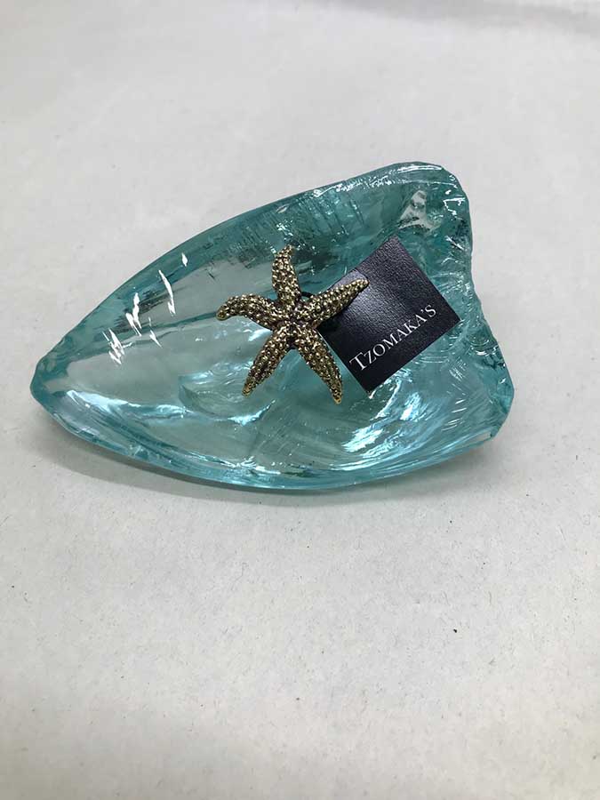 Αστερίας σαγρέ από ορείχαλκο πάνω σε ακανόνιστης μορφής τυρκουάζ γυαλί.