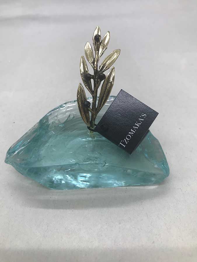 Ελιά μικρή από ορείχαλκο πάνω σε ακανόνιστης μορφής γυαλί.