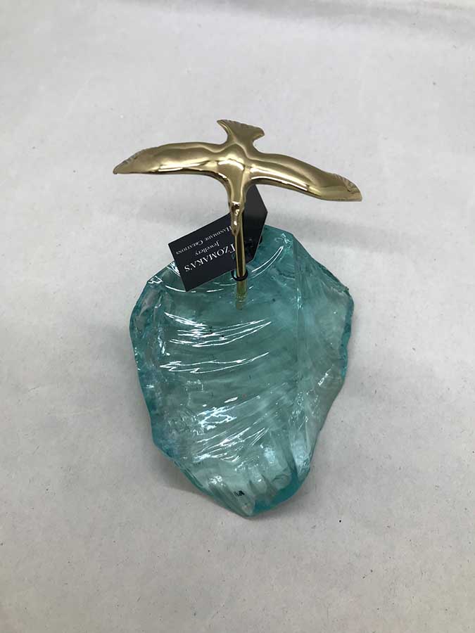 Γλάρος από ορείχαλκο πάνω σε ακανόνιστης μορφής τυρκουάζ γυαλί.