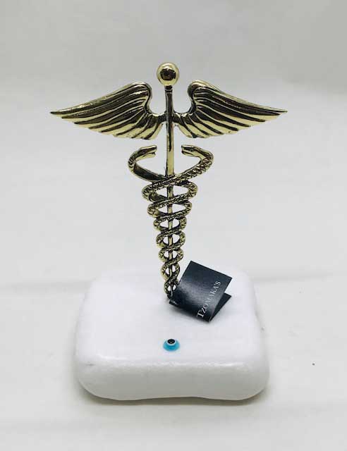 Ιατρόσημο από ορείχαλκο πάνω σε λευκό μάρμαρο.