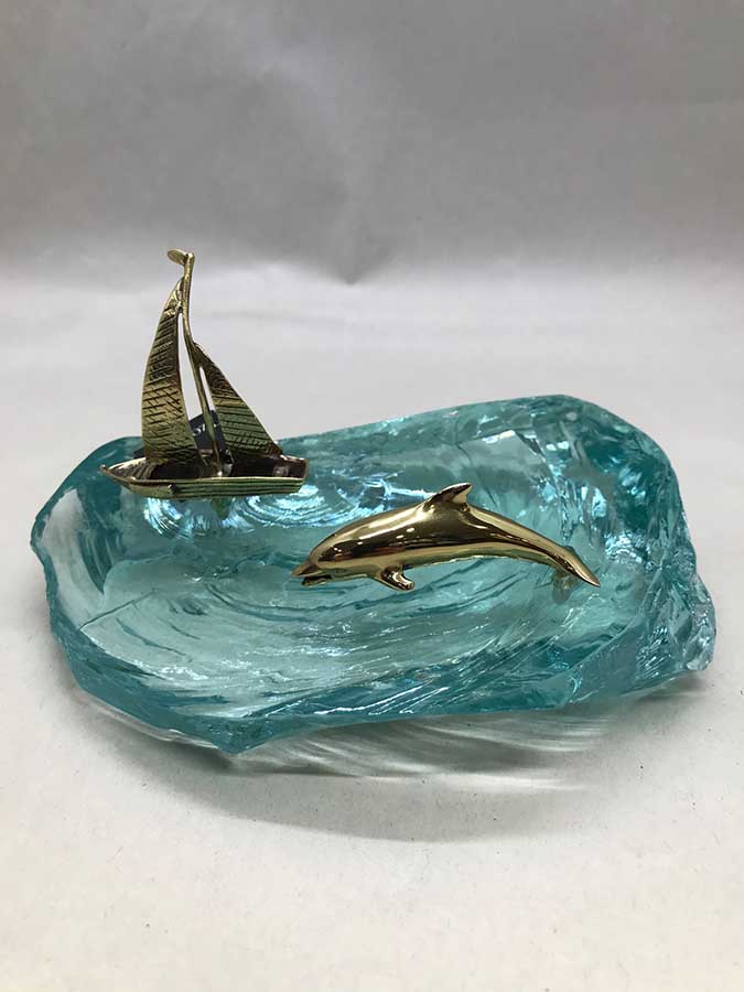 Καράβι από ορείχαλκο με 1 δελφίνι πάνω σε τυρκουάζ ακανόνιστο γυαλί.