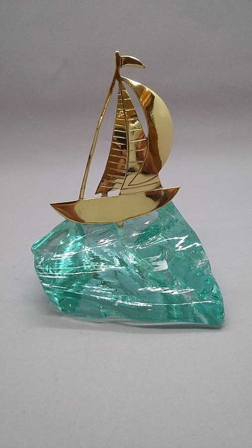 Καράβια από ορείχαλκο πάνω σε ακανόνιστο τυρκουάζ γυαλί.