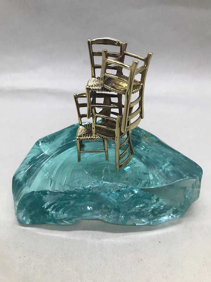 Καρέκλες τετραπλές από ορείχαλκο πάνω σε ακανόνιστης μορφής τυρκουάζ γυαλί.