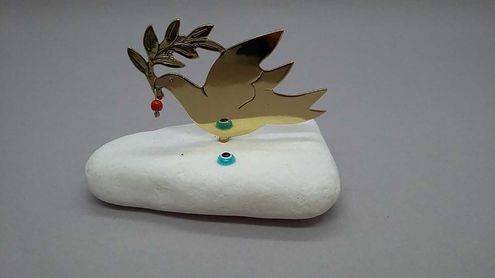 Περιστέρι από ορείχαλκο με κλαδί ελιάς πάνω σε λευκό μάρμαρο.