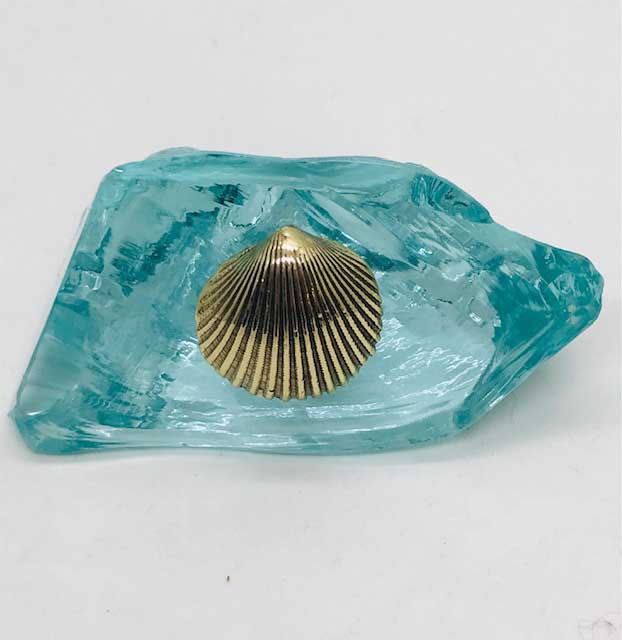 Πεταλίδα από ορείχαλκο πάνω σε ακανόνιστης μορφής τυρκουάζ γυαλί.