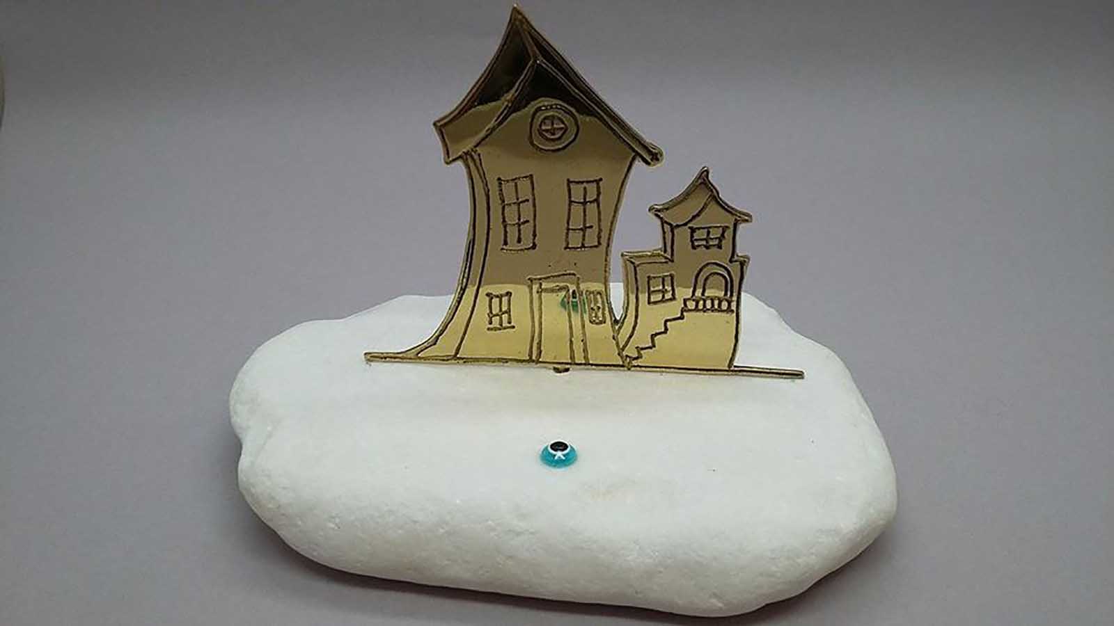 Σπίτι διπλό από ορείχαλκο πάνω σε λευκό μάρμαρο.