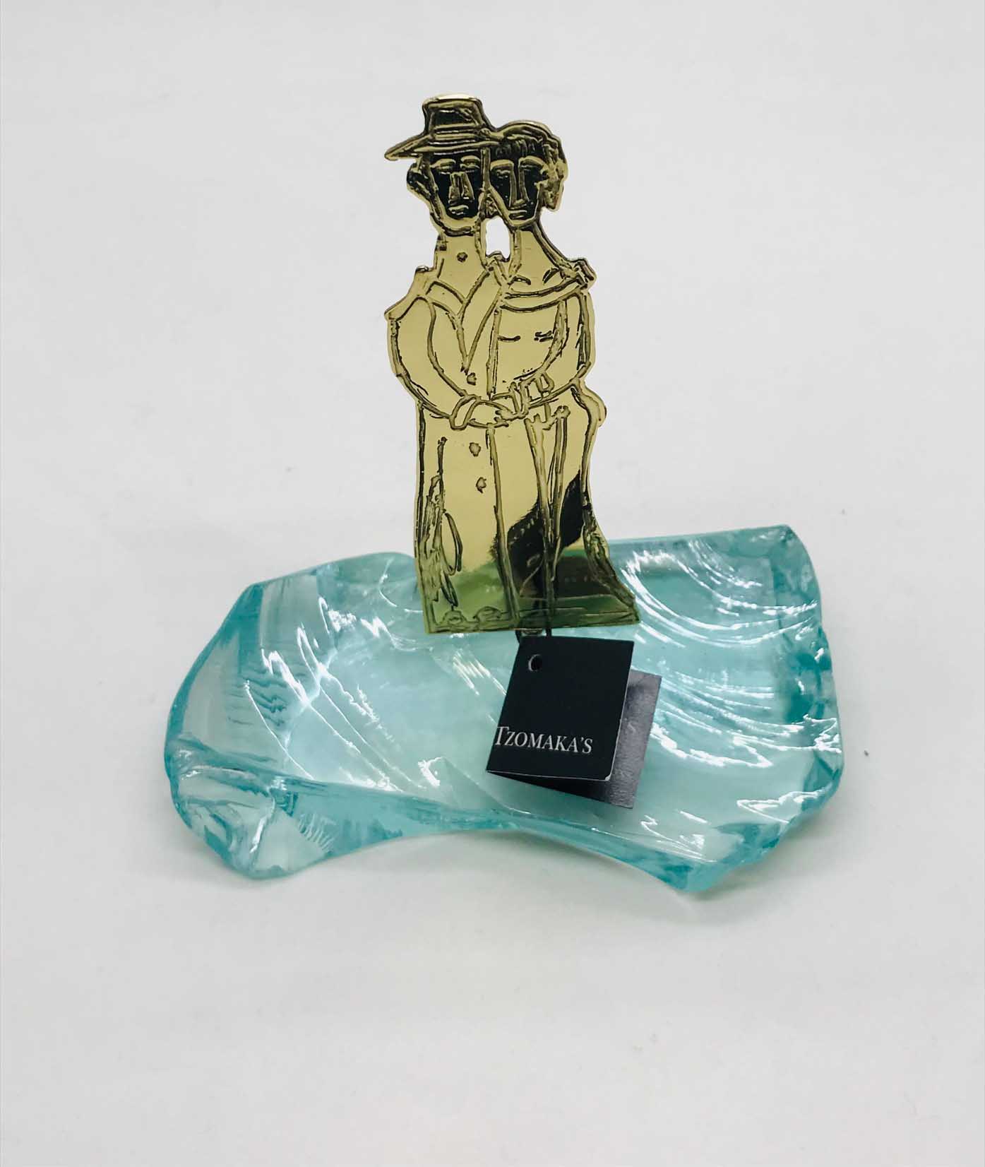 Ζευγάρι από ορείχαλκο πάνω σε ακανόνιστης μορφής τυρκουάζ γυαλί.