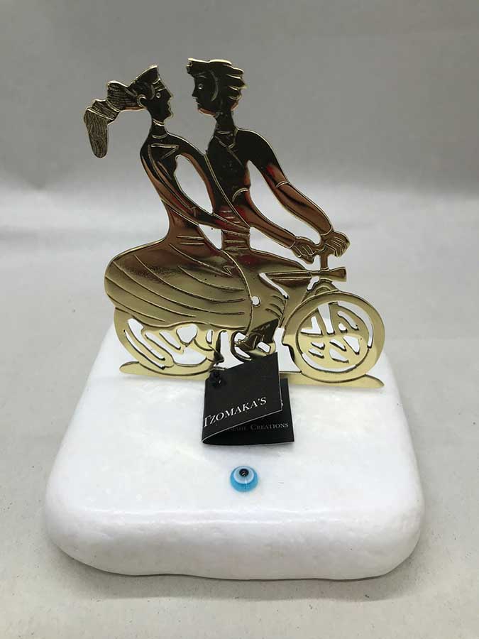 Ζευγάρι σε ποδήλατο από ορείχαλκο πάνω σε λευκό μάρμαρο.